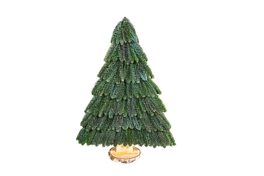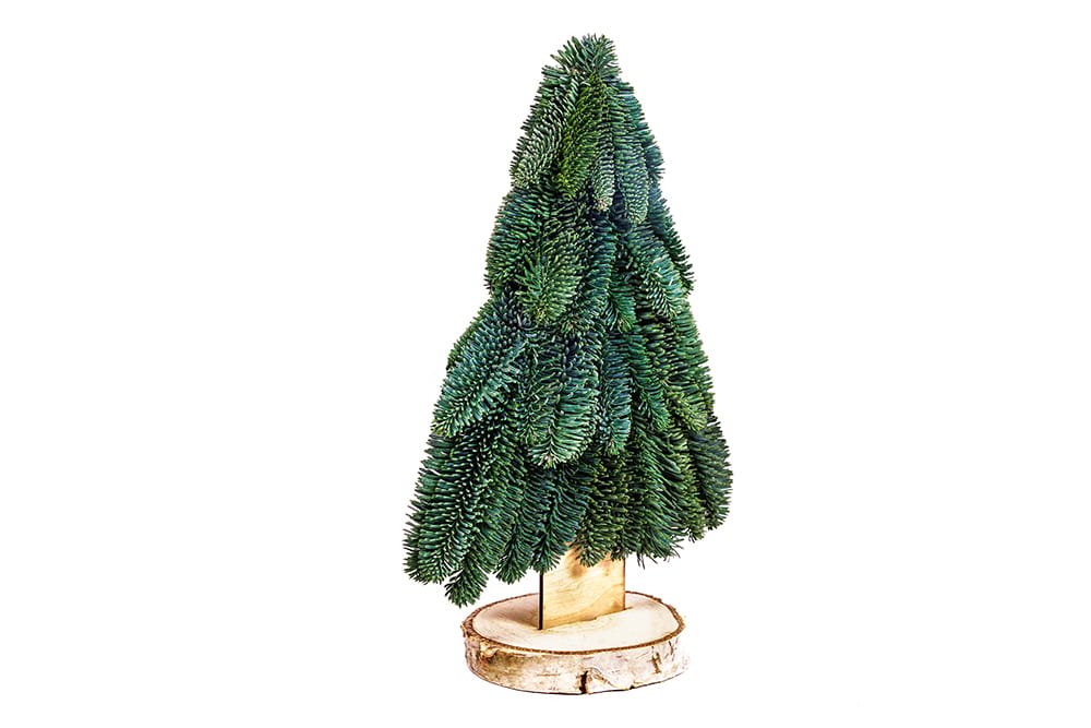 Naturalna, piękna świąteczna mini choinka to urokliwa alternatywa dla tradycyjnych drzewek, idealna do mniejszych przestrzeni lub jako ozdoba stołu. Wykonana z żywych gałązek jodły, przymocowanych do solidnej drewnianej sklejki, prezentuje się wyjątkowo oryginalnie, a zarazem naturalnie. Całość oparta jest na stabilnym, drewnianym krążku, który zapewnia jej odpowiednią równowagę. Dzięki płaskiemu kształtowi, choinka doskonale pasuje na blaty, półki czy stoliki, wprowadzając do wnętrza świąteczny klimat. Dodatkowo, po zdemontowaniu podstawki, może służyć jako wisząca dekoracja na ścianie lub w oknie.