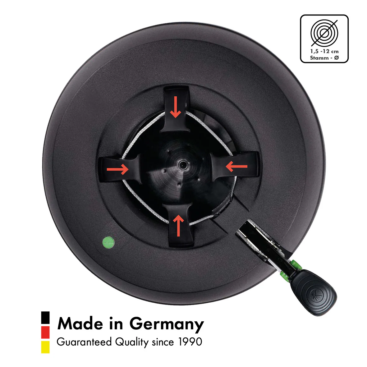 - Pętla ze stalowej linki zapewnia równomierne zaciskanie się szczęk mocujących na pniu drzewka i jego bezpieczne zamocowanie.
