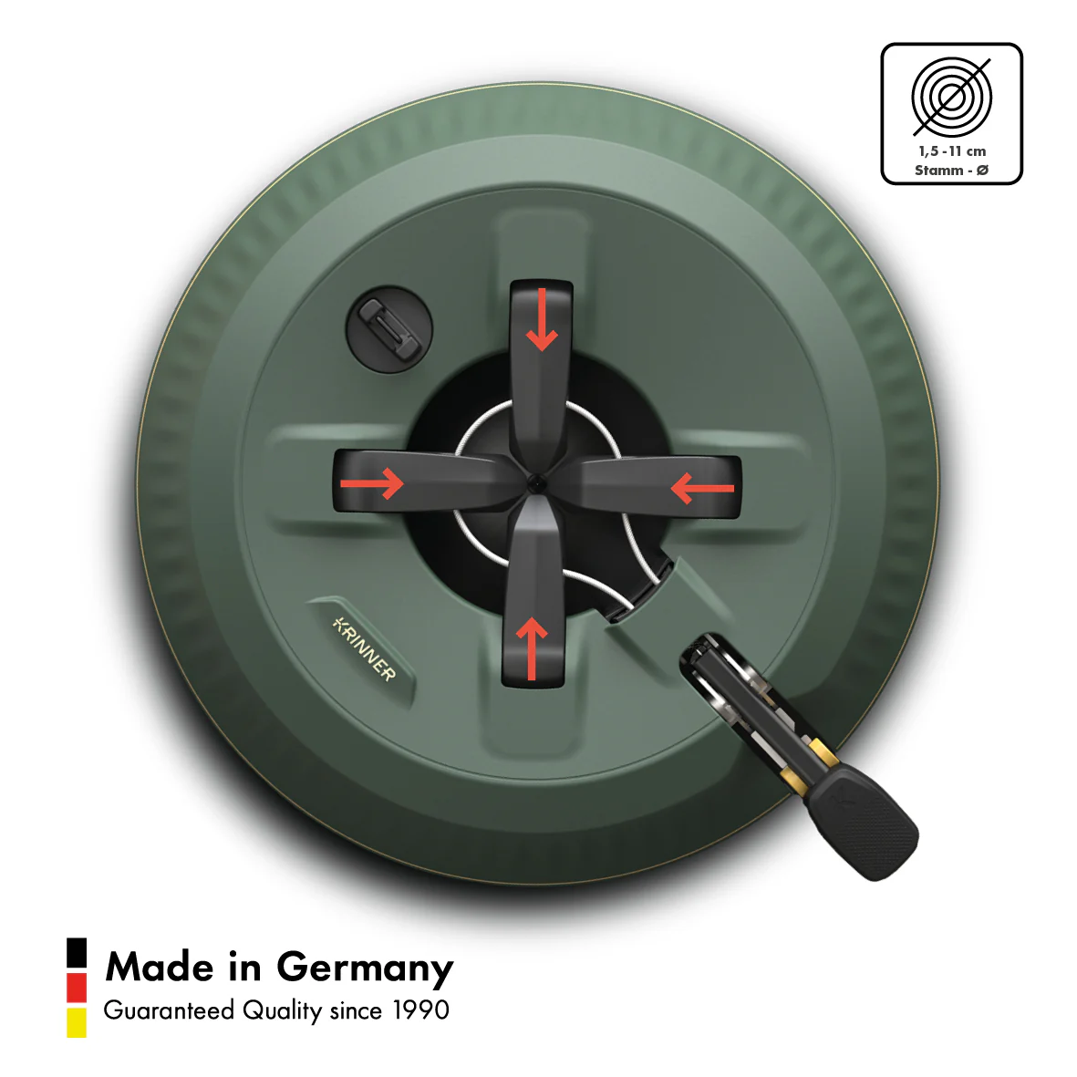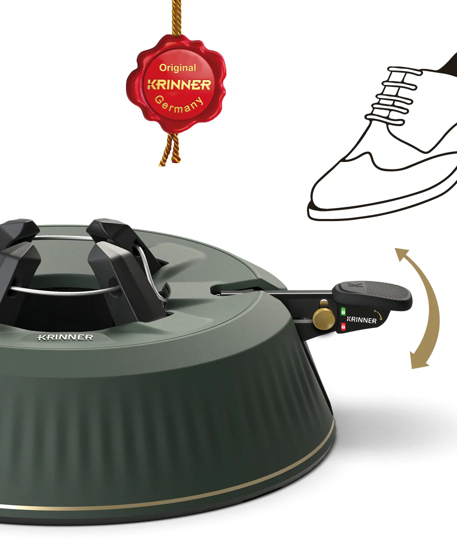 Stojaki KRINNER są wyposażone w oryginalną technologię pojedynczej liny, która zapewnia równomierny nacisk na pień, gwarantując stabilność drzewka, niezależnie od jego kształtu. Innowacyjny pedał bezpieczeństwa z większą powierzchnią styku ułatwia obsługę, a opatentowany system pasów bezpieczeństwa chroni przed przypadkowym przewróceniem choinki. Zintegrowany zbiornik na wodę oraz większy wskaźnik poziomu wody pomagają utrzymać świeżość drzewka przez wiele tygodni.